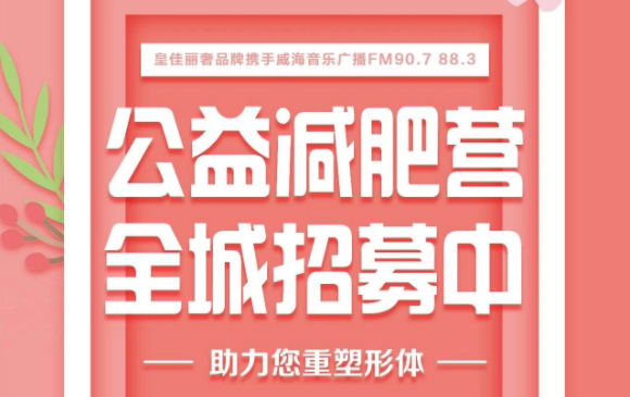 皇佳丽奢携手FM90.7 88.3威海音乐广播举办公益减脂营活动活动特点:公益免费;活动形式:专业减肥顾问全程指导,私人订制减肥方案;活动目的:帮助肥胖人群摆脱肥胖的困扰!活动报名:不限性别活动名额:10名活动招募期:5月1日—5月10日报名方式1:扫描以下二维码获取报…